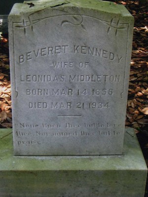 "Beveret Kennedy, wife of Leonidas Middleton, Born Mar. 14, 1856; Died Mar. 21, 1934; None knew thee but to love thee. Nor named thee but to praise."